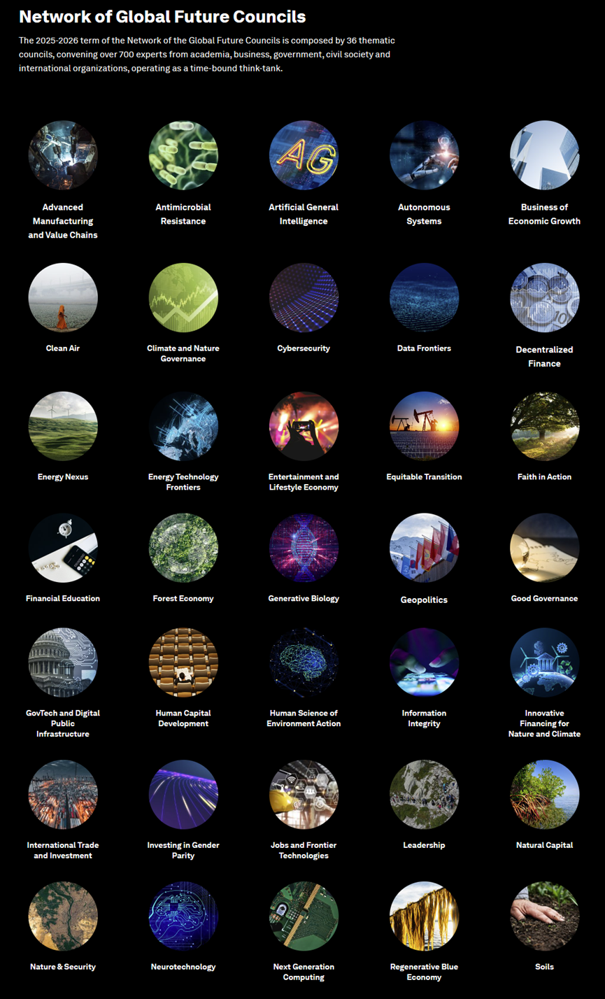 作为世界经济论坛的重要智库网络,全球未来理事会以“邀请制”方式汇聚全球学术界、企业、政府、非营利组织等领域的顶尖专家及领袖,围绕全球性议题开展前瞻研究与跨界协作,为应对日益复杂的重大挑战提供具有全球影响力的变革性思想。2025-2026年任期的全球未来理事会网络由36个专题理事会组成,共邀请了全球700多位高层次专家参与,聚焦人工智能、再生蓝色经济、气候与自然管治等重大议题。
