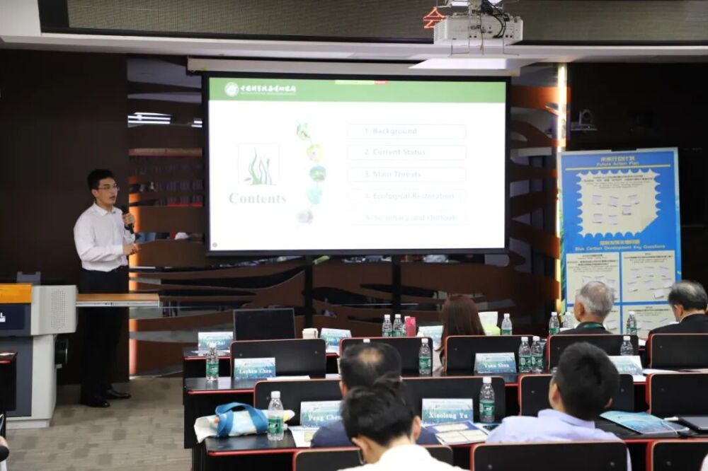广西海洋科学院(广西红树林研究中心)邱广龙副院长,厦门大学程鹏教授、余小龙副教授、陈蔚芳高级工程师,厦门大学博士研究生孙家鑫及张敏、硕士研究生李佳霖,中国科学院海洋研究所博士研究生刘明杰作报告。报告围绕“中国南方海草床的修复进展和实例展示”“中国海草床沉积物有机碳储量”“数值模型模拟”“遥感技术”“海草床中的有机碳和无机碳循环”“单光子荧光光谱激光雷达”“中国北方海草床的修复进展和实例展示”等方面进行研讨。
