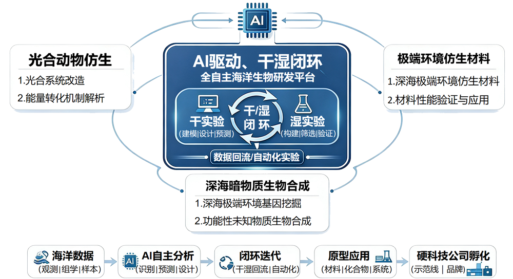 中心旨在引领海洋生物研发“范式革命”,通过构建“AI驱动+干湿闭环”的智能体系,大幅提升研发效率,聚焦光合动物仿生、极端环境材料、深海暗物质生物合成三大生物智造前沿方向,抢占蓝色生物经济制高点,孵化硬科技企业。