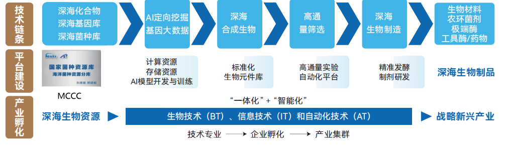 The Center focuses on the industrial development of deep-sea biological genetic resources, with an emphasis on biomanufacturing and health-related applications. It is advancing an integrated technology framework spanning resource discovery, genetic modification, and product development, leveraging AI-enabled tools and capital linkages to support deep-sea biomanufacturing.