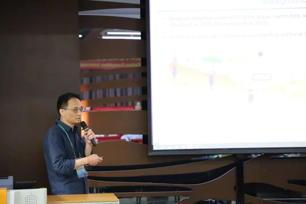 厦门大学沈渊教授介绍了海草生态系统水体碳足迹的示踪研究,展示了不同季节和区域的二氧化碳通量变化,探讨了海气二氧化碳交换的调控机制,指出海草在水体溶解有机碳的生产和释放方面起到重要作用。