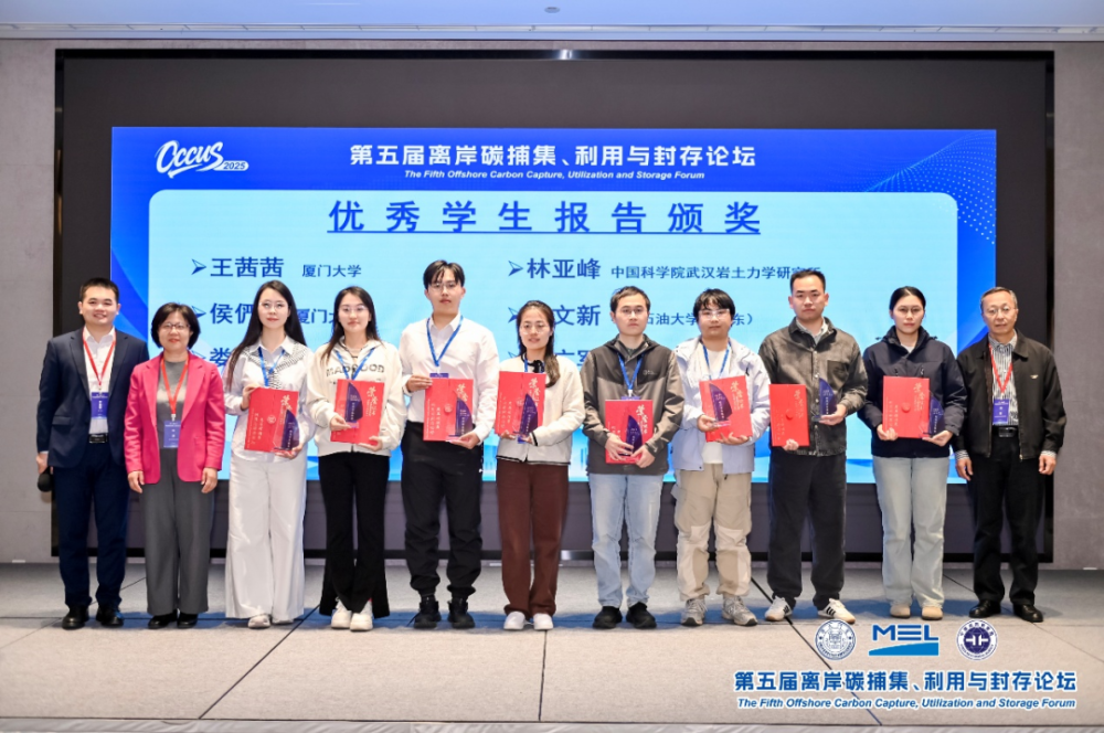 本届论坛设立了优秀学生报告奖。厦门大学王茜茜、侯俨倪,中国科学院武汉岩土力学研究所林亚峰,中国石油大学(华东)周文新、娄本奎,大连理工大学巩广军、张敬茹,浙江大学朱洁共8位研究生获奖。中国地质调查局青岛海洋地质研究所副所长印萍、中海油研究总院新能源研究院副院长刘强为获奖学生颁奖。